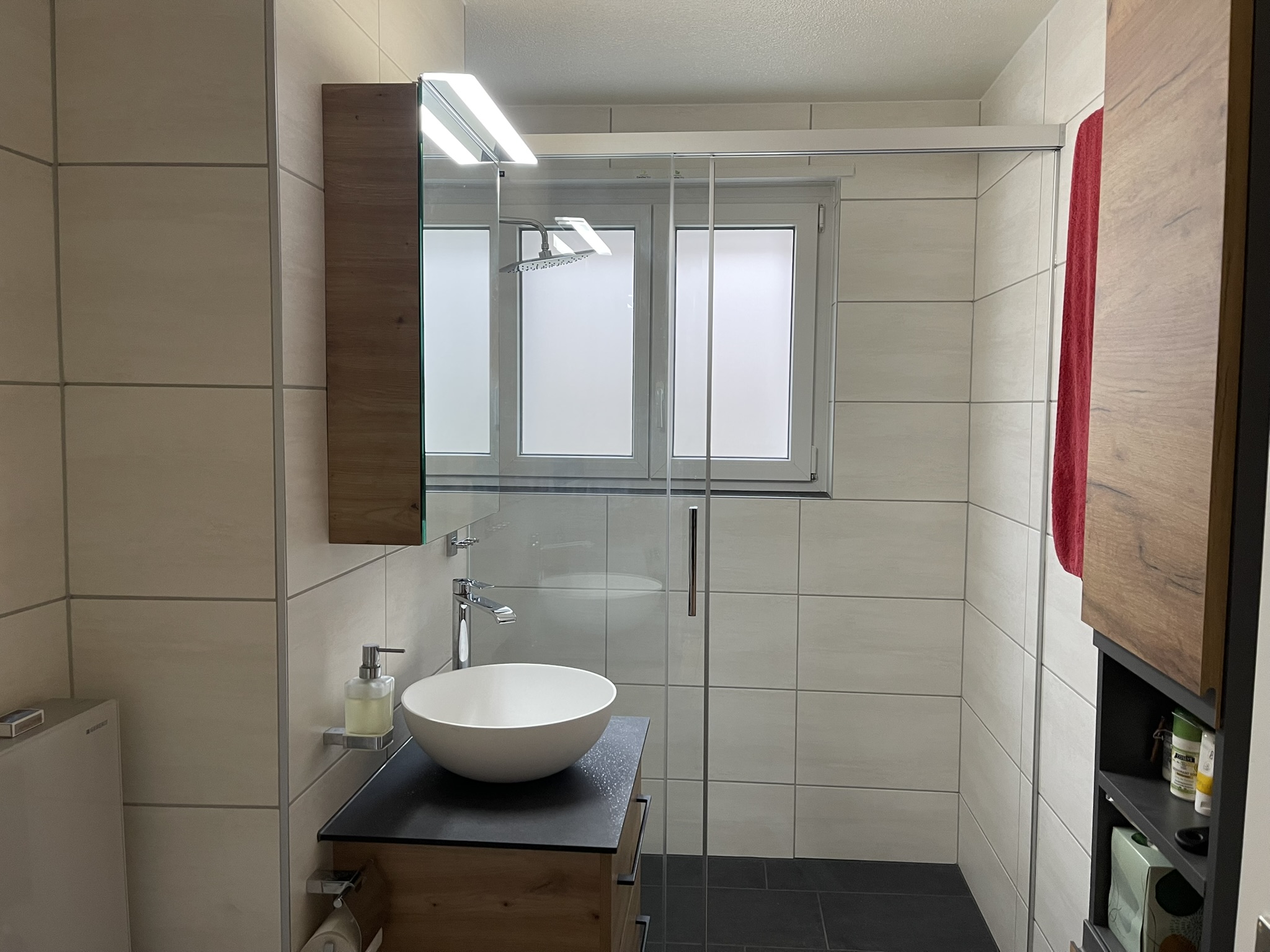 Rénovation intérieure d’un appartement avec réfection totale de la salle de bains et de la cuisine. Pose d’une nouvelle armoire intégrée dans le hall d’entrée, et remise à jour des installations électriques.